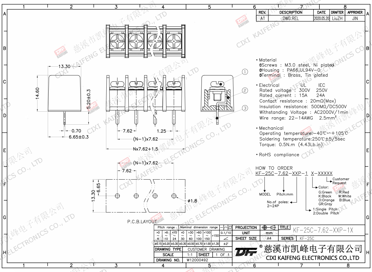 Material:M3.0 Steel,Ni platedTerminal:Brass,0.7t Ni platedHousing: PA66,UL94V-0ElectricalULIECRated voltage300V 250V Rated current15A24AInsulation resistance500MΩ/DC500VWithstanding voltage AC2000V/1minWire range22-14AWG 2.5mm2MechanlicalTemp.rang-40℃~+105℃ Torque0.5N.m 4.4Lb.in