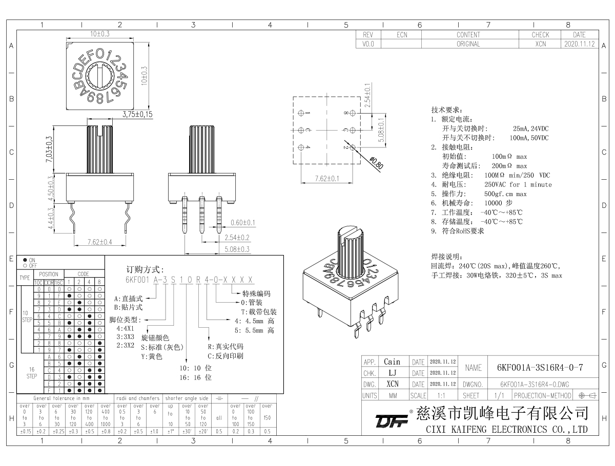 旋鈕開關(guān) 材質(zhì)電鍍:25mA,24VDC 開與關(guān)不切換時:100mA,50VDC 接觸電阻初始值:100mΩ max壽命測試后:200mΩ max絕緣電阻 :100mΩ min/250 VDC耐電壓 :250VAC for 1 minute操作力 :500gf.cm max機械壽命 :10000步